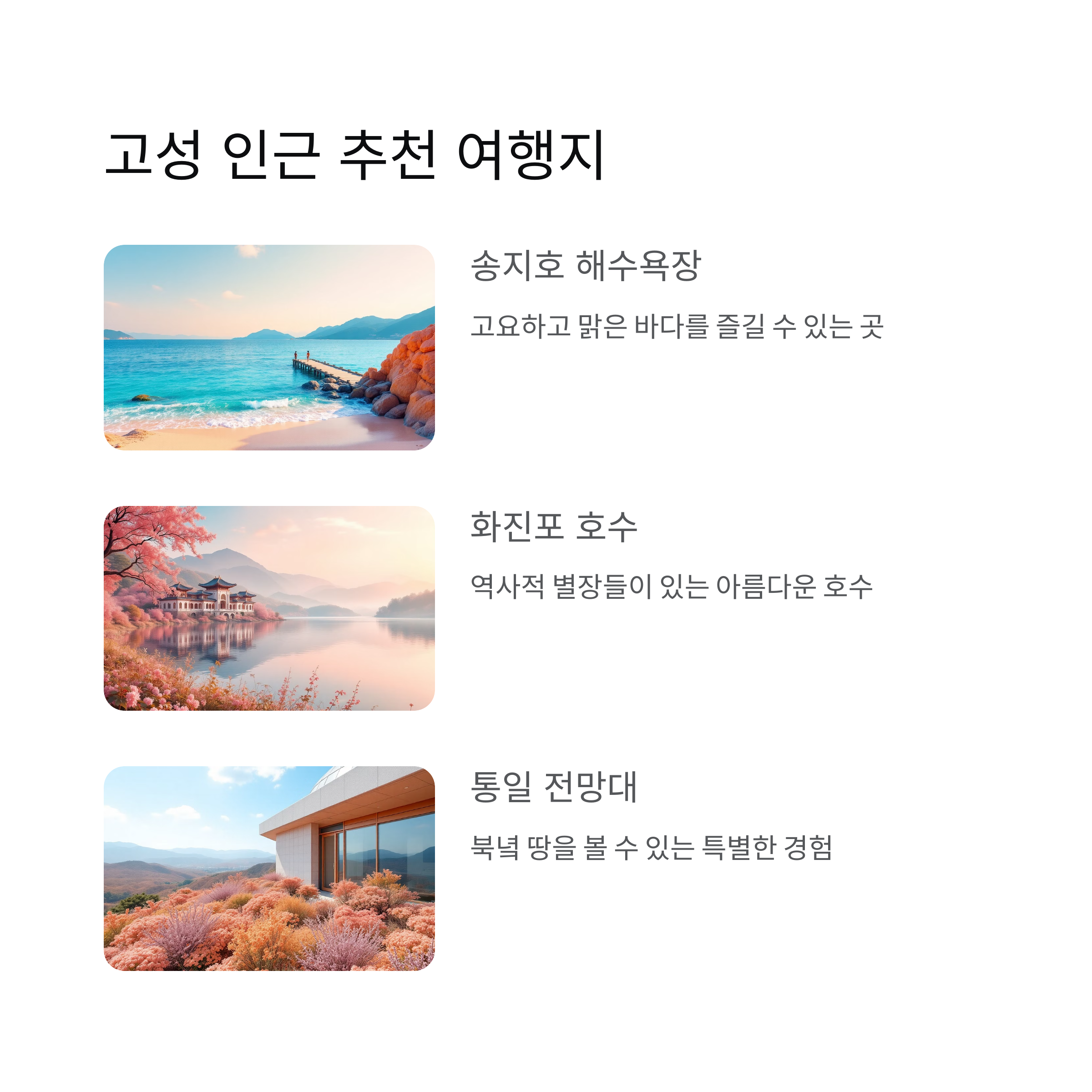고성에는 하늬라벤더팜 외에도 매력적인 여행지가 많아요. 하루만으로는 부족할 정도예요. 특히 자연을 좋아하는 분이라면 이 근처 명소들도 꼭 들러보시길 추천해요.