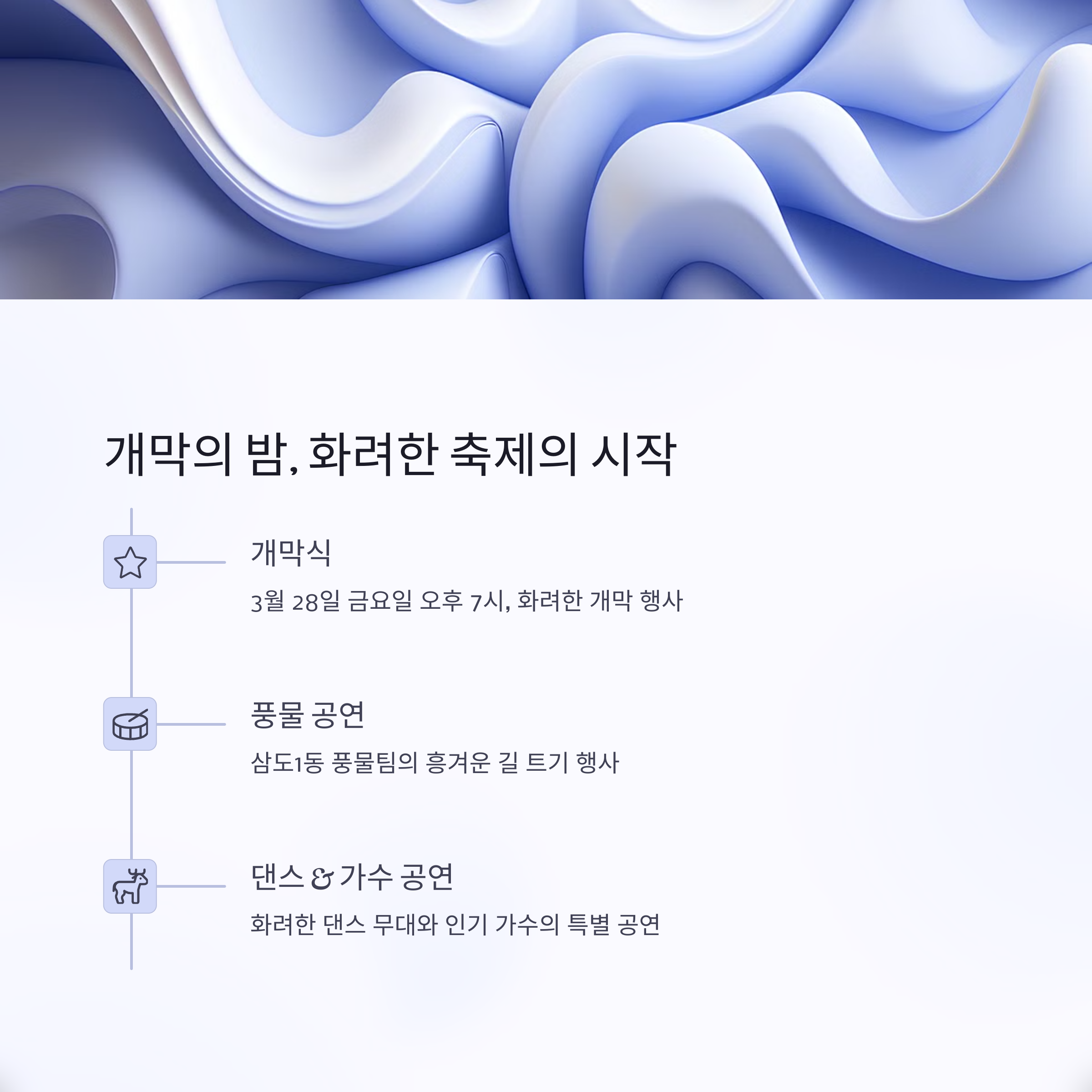 | 3월 28일 (금) | 오후 7시 개막식, 삼도1동 풍물팀 길 트기, 댄스 및 초청가수 공연 |